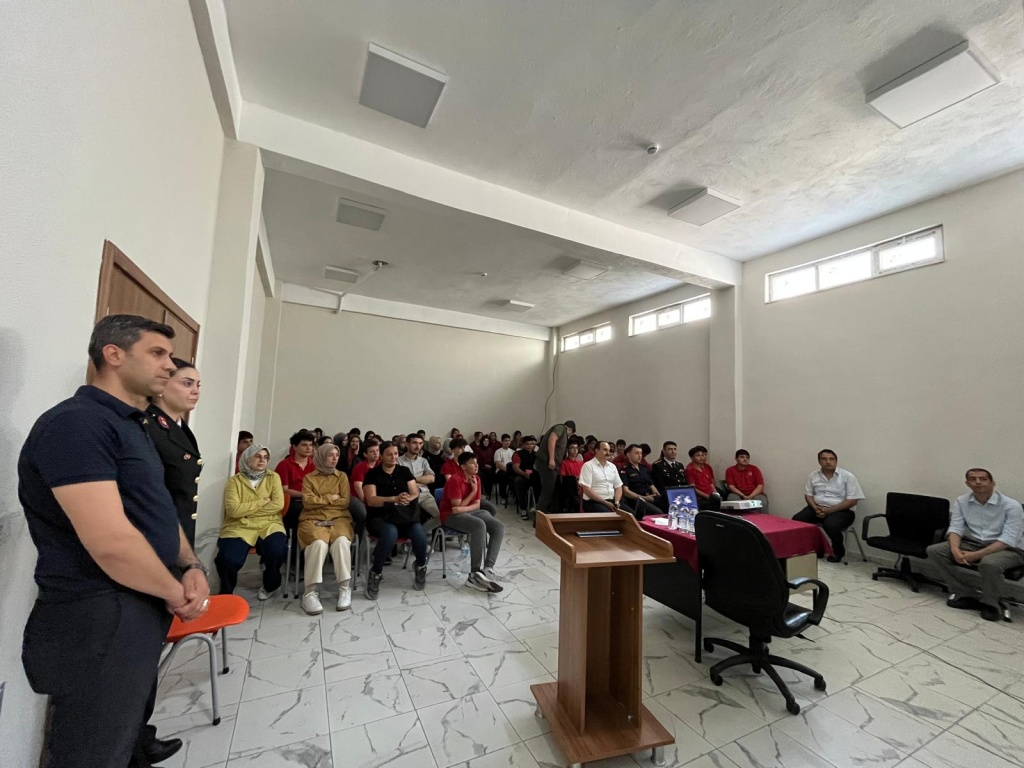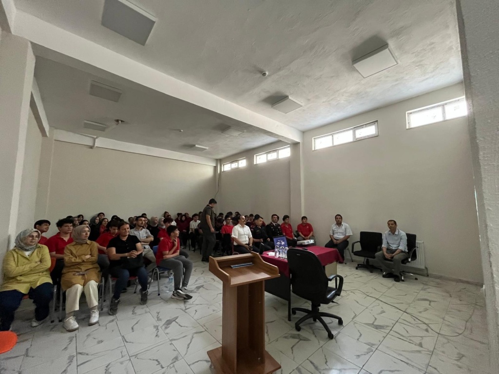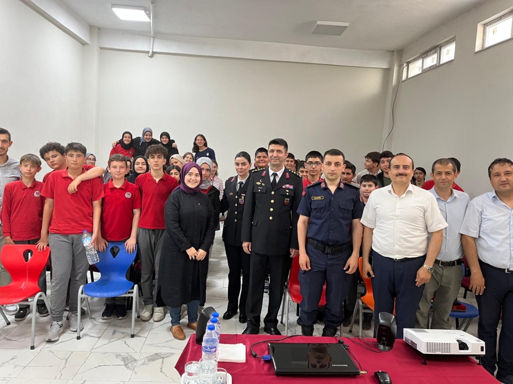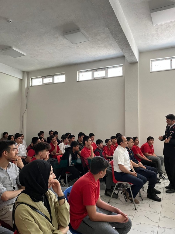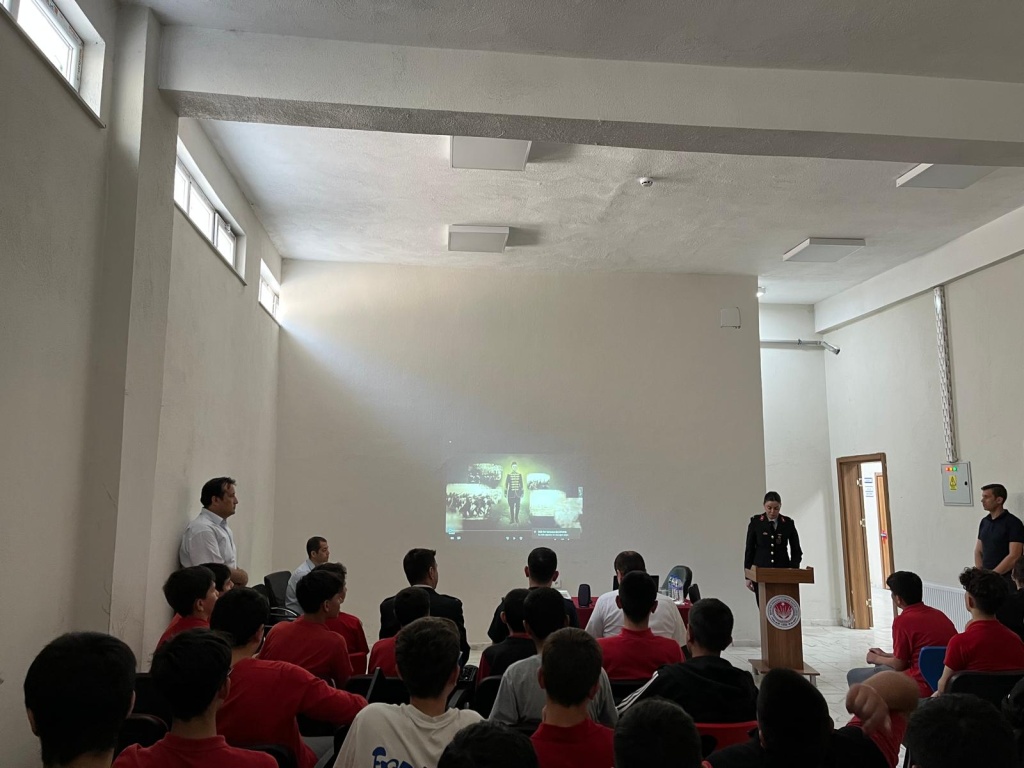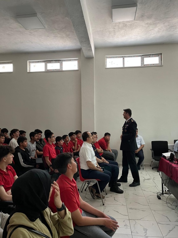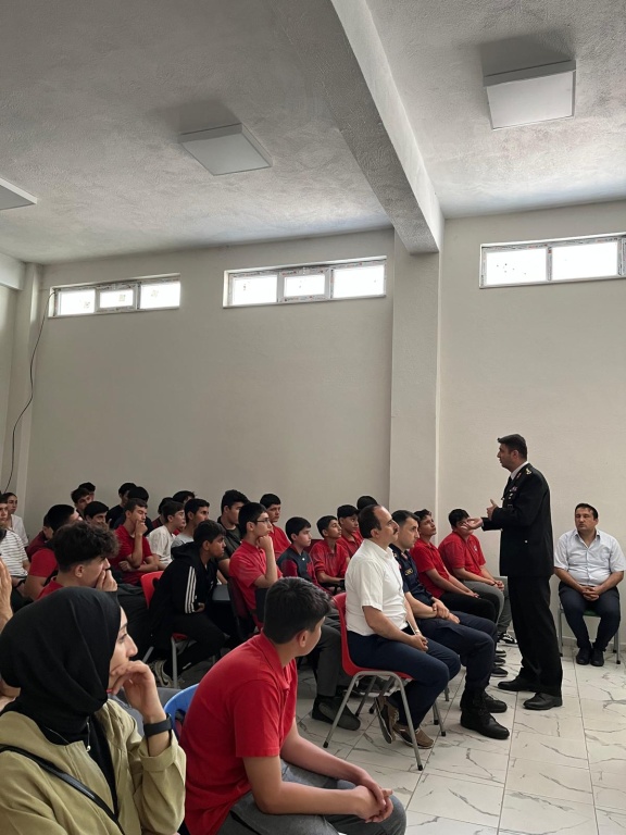 2024-2025 eğitim öğretim yılı içinde uygulanmakta olan, okul rehberlik servisi tarafından yürütülen "İşi Ehlinden Öğreniyorum" projesi kapsamında yedinci oturum gerçekleştirilmiştir. 02.06.2025 Pazartesi günü 14.00-15.00 saatleri arasında okul konferans salonunda düzenlenen seminere, öğrencilerin merak ettikleri meslekler listesinde 11. sırada yer alan meslek olan jandarma mesleğinin tanıtımı için Balıkesir İl Jandarma Komutanlığı'nda görevli Jandarma Albay Sertan KOÇ, yine aynı yerde görevli Jandarma Maliye Teğmen Ayşe Kaniye MÜLAYİM ve Manyas İlçe Jandarma Komutanı Üsteğmen Fatih ERGÜN okulumuza davet edilmiştir. Davetimize iştirak eden Jandarma Albay KOÇ; öğrencilerimize lise mezunu olmalarından jandarma mesleğini seçmeye kadar giden yolculukta adım adım hangi aşamalardan geçmeleri gerektiği hakkında bilgi vermiştir. Etkinliğin başında öğrencilerimize Jandarma Genel Komutanlığı tarafından hazırlanan videolar izletilerek gerekli bilgilendirmeler aktarılırken, öğrencilerin video içeriklerindeki müzik ve görsel uyumlarını izlerken zaman zaman coşkulandıkları gözlemlenmiştir. Videoların ardından Jandarma Albay KOÇ, jandarma genel komutanlığının ordu yönetiminden ayrılan kısımlarından, jandarma ve sahil güvenlik akademisine seçmelerde dikkat edilecek hususlardan, bir jandarma olarak mesleğini icra ederken ne gibi durumlarla karşılaştığından detaylı bir şekilde bahsetmiştir. Jandarma Albay KOÇ, sunumunun ardından öğrencilerden gelen soruları İlçe Jandarma Komutanı Üsteğmen ERGÜN ile birlikte cevaplandırmış, öğrencilerin jandarma mesleğinin olumlu ve olumsuz yönlerini daha iyi anlamalarına ve gelecek planlaması yaparken bu mesleği seçmelerinin beraberinde getirebileceği riskleri ve kazançları açık ve gerçekçi bir şekilde kavramalarına yardımcı olmuşlardır. Seminerin sonunda katılımcılara plaketleri sunularak öğrencilerimizin meslek yolculuklarına yaptıkları katkılardan dolayı teşekkür edilmiştir.